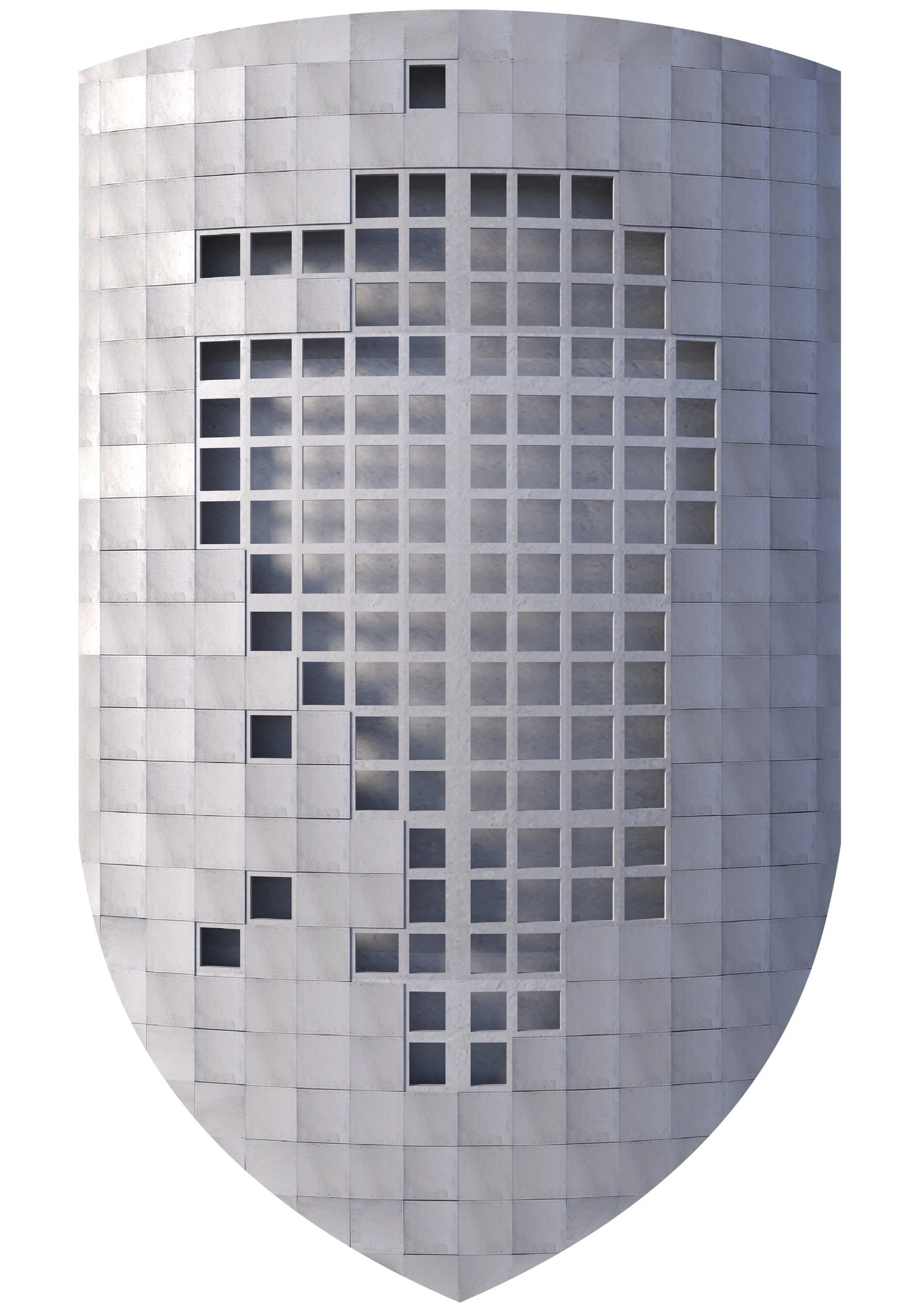 The exhibition features Beliaeva’s Shield, the first exhibited work from a new series by the artist of 3D rendered sculptures printed on dibond aluminium, toeing the line between sculpture and photography. The work features the shield of Kyiv’s Mother Ukraine, the gargantuan 335-foot tall public sculpture located in the heart of the city. On July 29, 2023, the statue’s historic soviet symbols were removed, leaving a grid of unfilled space which Beliaeva recreates exactly in Shield. The work explores the decommunisation of Ukraine and its decoupling from Russia, also representing the pixelated camouflage worn by Ukrainian soldiers. In early August, the empty grid was filled by a tryzub, the country’s national trident symbol.