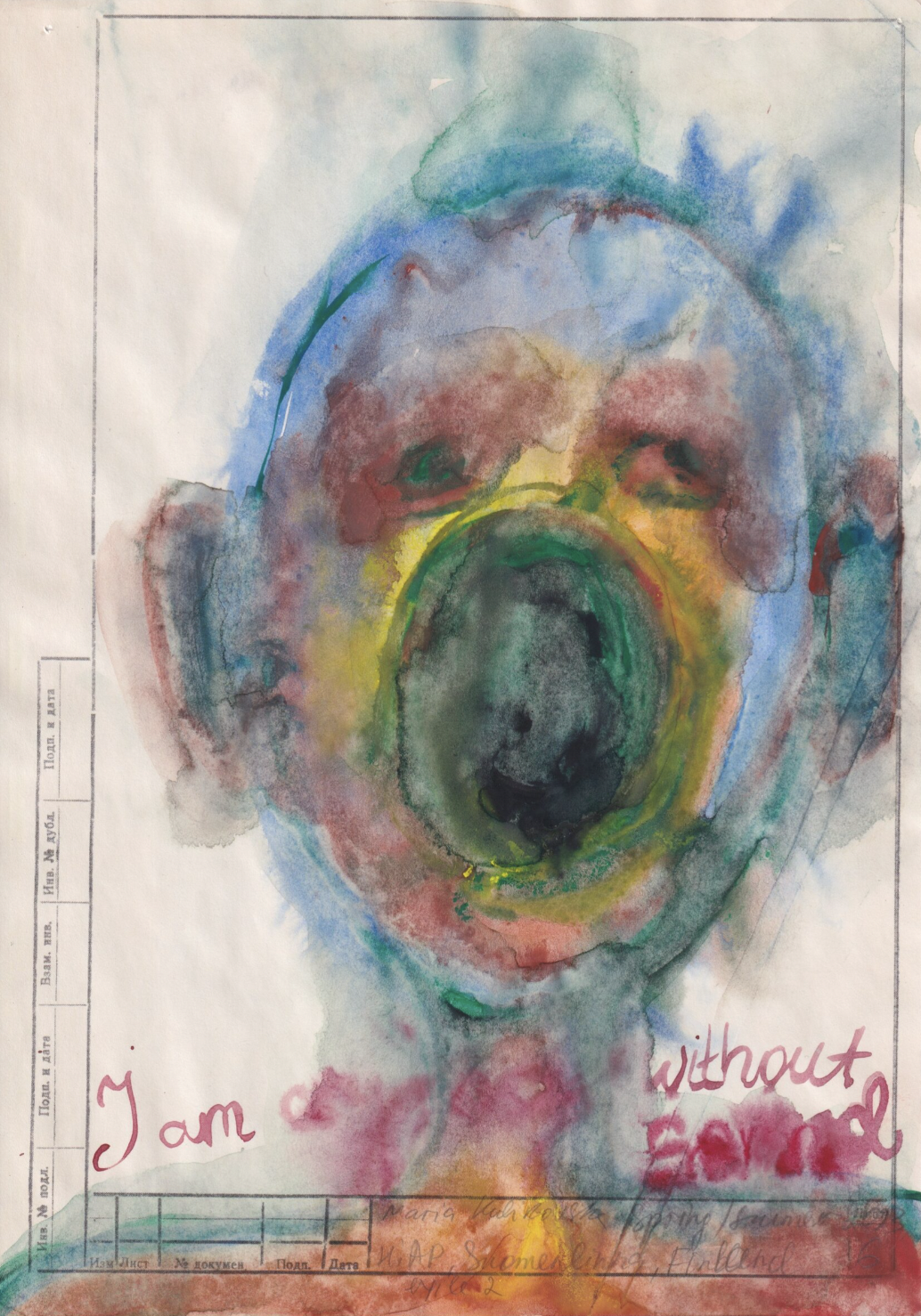 On display is Kulikovska’s Letter to Eva, a suite of 24 watercolors dedicated to the artist’s newborn daughter. When Kulikovska was forced to flee Ukraine with her child, she instinctively grabbed her watercolors and a stack of Soviet-era architectural paper, feeling she would need to work. Produced during a nomadic period which saw Kulikovska travel with her child throughout Europe exhibiting her performance art, Letter to Eva explores the toll of war on the body and mind. Both gruesome and gentle, the series is both a lament for those who have been lost and a celebration of her daughter’s life. The work is accompanied by a poem by Kulikovska, which is included in the exhibition companion reader.