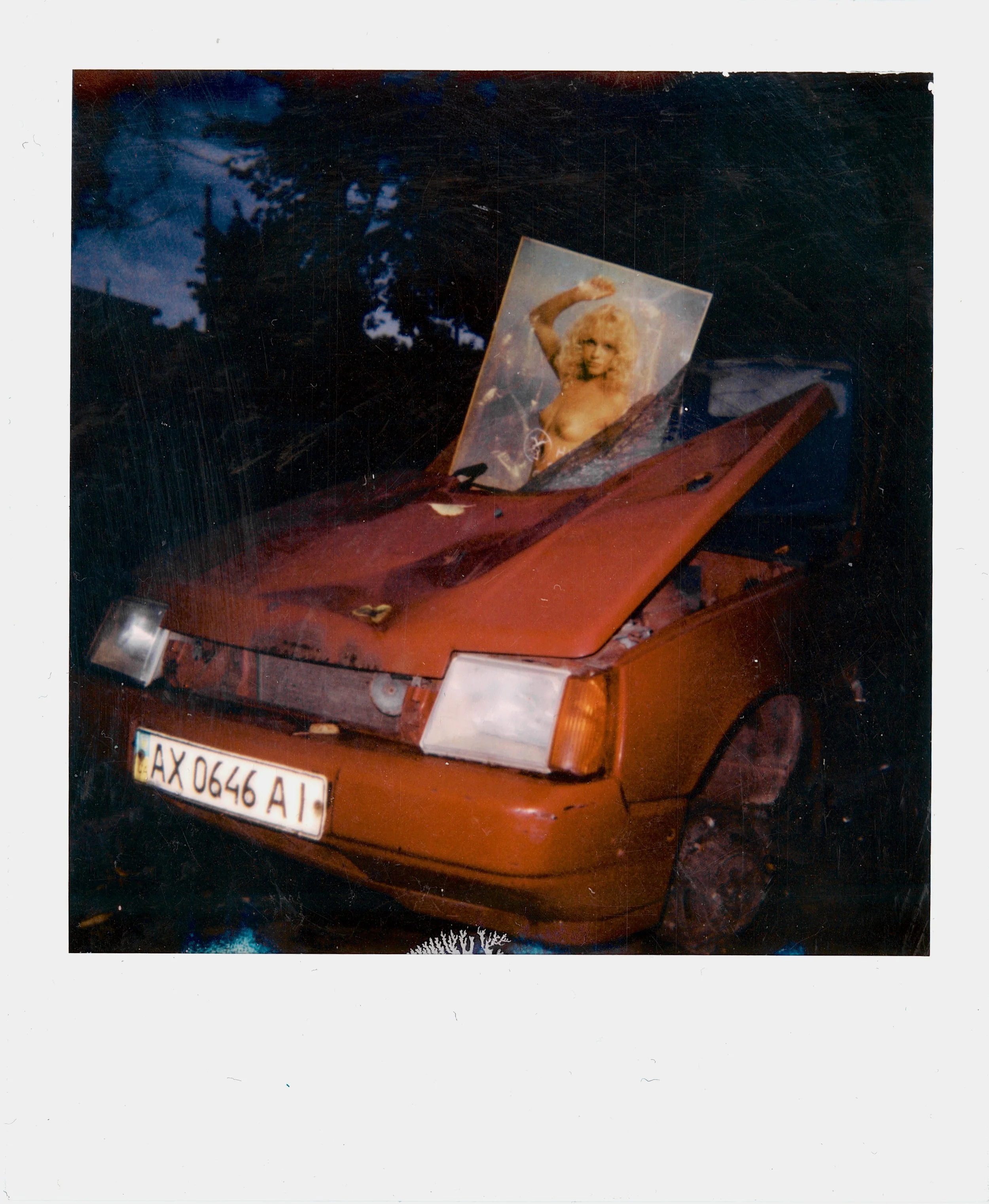 Thousand Yard Stare also features Untitled #30, a color Polaroid exposed in Northern Saltivka, a residential neighborhood in Kharkiv completely destroyed by Russian artillery in 2022. The Polaroid is an original artwork/physical document, bearing scratches that suggest the road it has traveled to get here. And still, there is a clash in tone between the harsh reality of the burnt-out car and the surreality of the painting piercing the windshield. Part of an ongoing series of Polaroids by Marker.