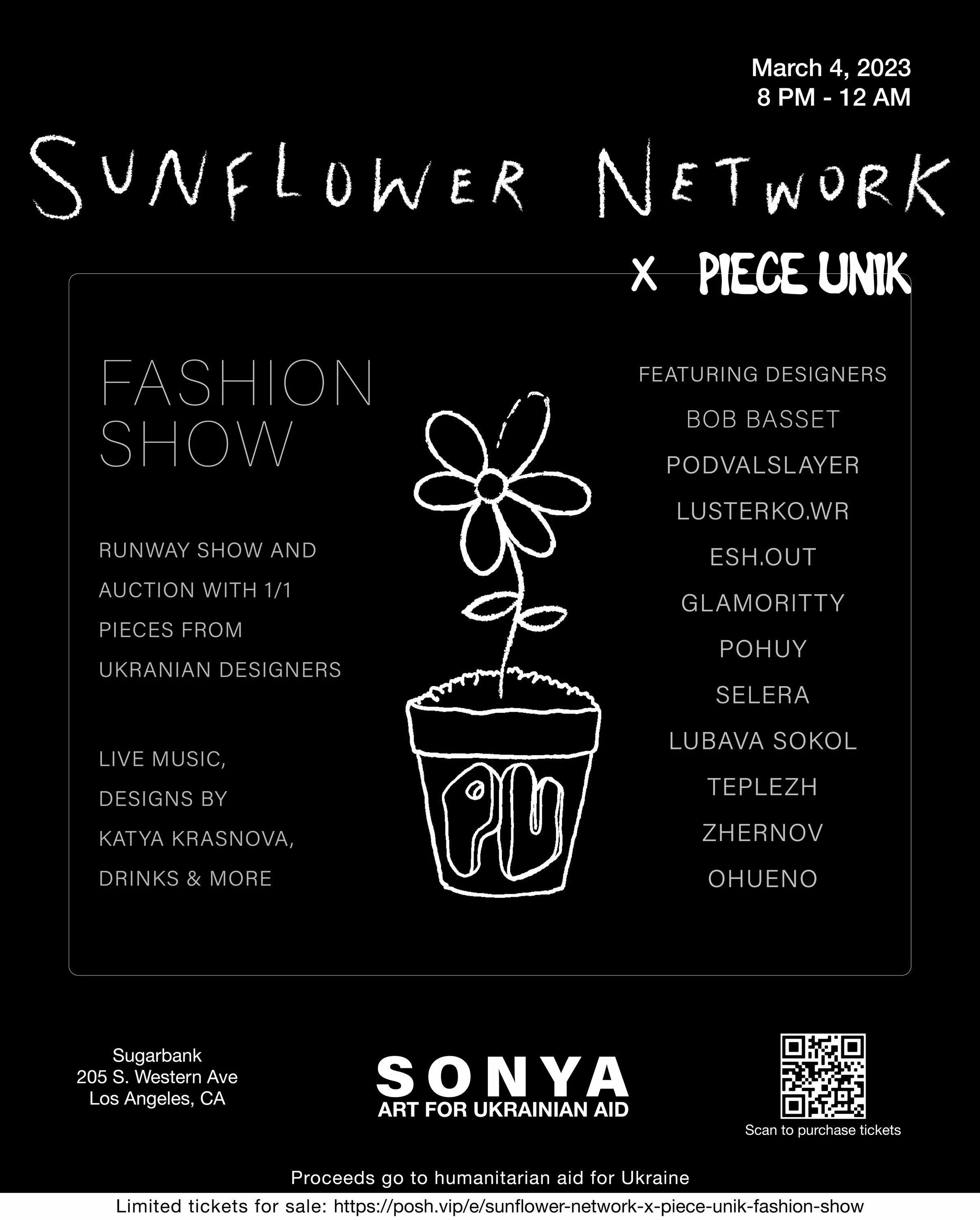 Sunflower Network is a community united around making a difference. The final event our Los Angeles event series will be a Fashion Show on March 4th at Sugar Bank in Koreatown in partnership with PieceUnik. There will be 12 one-of-one pieces each created by Ukrainian designers that will be modeled and auctioned off night of with all proceeds going to direct aid. Please check out our amazing artists on instagram: @bobbasset, @podvalslayer, @lusterko.wr, @esh.out, @glamoritty, @the.pohuy, @lubavasokol, @teplezh, @zhernov_artifactory, @ohuenocom, @m1r_kyiv. All proceeds from the event will help fund our upcoming mission back to Ukraine this coming April, so every dollar counts. We cannot wait to see you soon! Slava Ukraini!